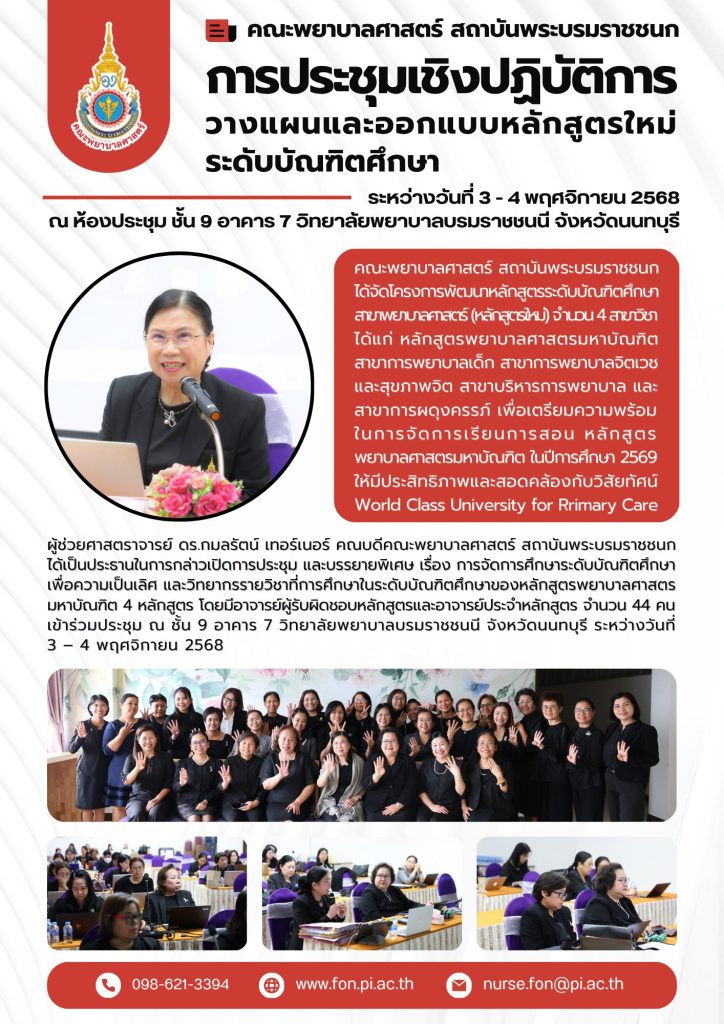 โดยผู้ช่วยศาสตราจารย์ ดร.กมลรัตน์ เทอร์เนอร์ คณบดีคณะพยาบาลศาสตร์ สถาบันพระบรมราชชนก ได้เป็นประธานในการกล่าวเปิดการประชุม และบรรยายพิเศษ เรื่อง การจัดการศึกษาระดับบัณฑิตศึกษาเพื่อความเป็นเลิศ และวิทยากรรายวิชาที่การศึกษาในระดับบัณฑิตศึกษาของหลักสูตรพยาบาลศาสตรมหาบัณฑิต 4 หลักสูตร โดยมีอาจารย์ผู้รับผิดชอบหลักสูตรและอาจารย์ประจำหลักสูตร จำนวน 44 คน เข้าร่วมประชุม ณ ชั้น 9 อาคาร 7 วิทยาลัยพยาบาลบรมราชชนนี จังหวัดนนทบุรี ระหว่างวันที่ 3 – 4 พฤศจิกายน 2568