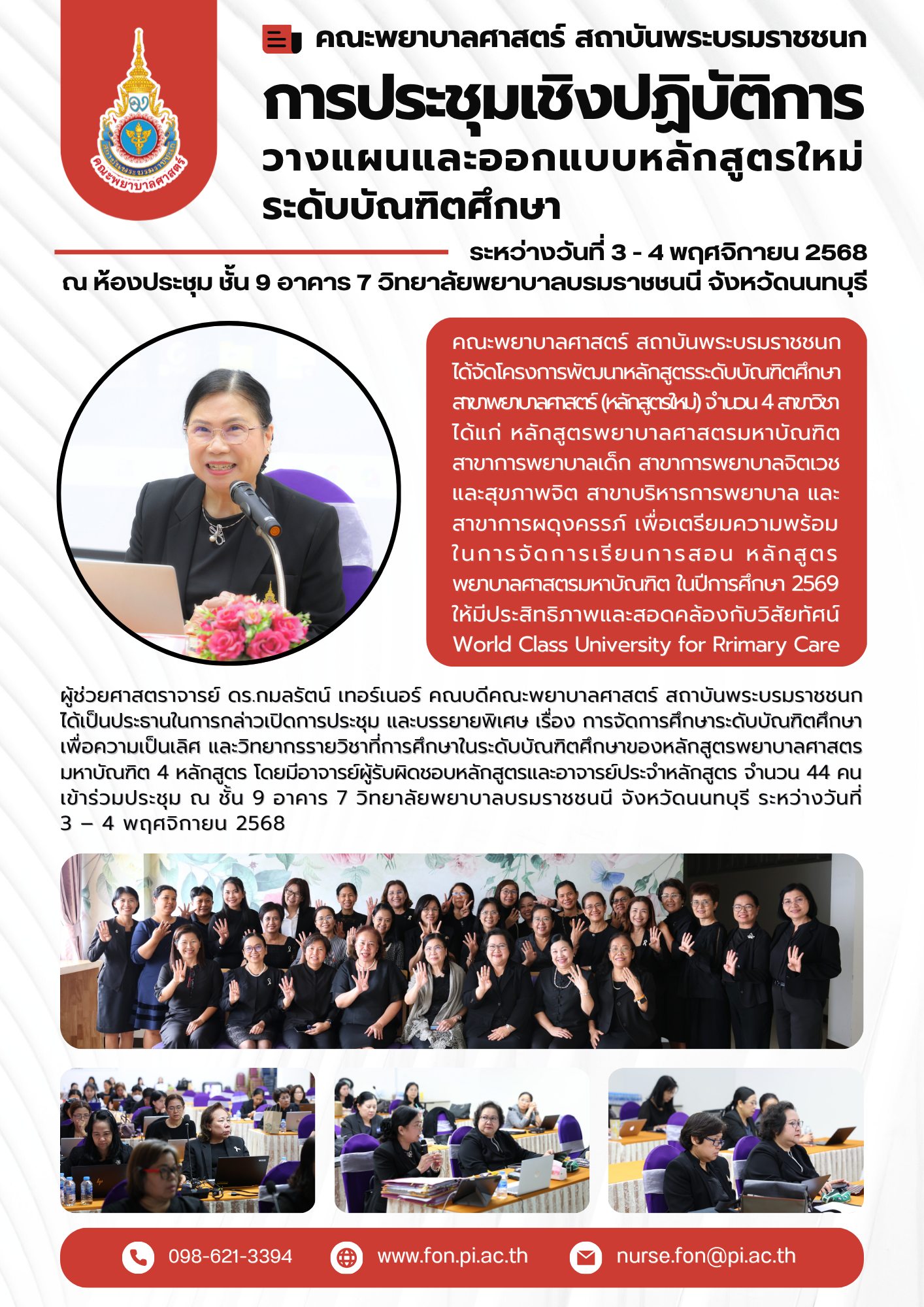 คณะพยาบาลศาสตร์ สถาบันพระบรมราชชนก ได้จัดโครงการพัฒนาหลักสูตรระดับบัณฑิตศึกษา สาขาพยาบาลศาสตร์ (หลักสูตรใหม่) จำนวน 4 สาขาวิชา ได้แก่ หลักสูตรพยาบาลศาสตรมหาบัณฑิต สาขาการพยาบาลเด็ก สาขาการพยาบาลจิตเวชและสุขภาพจิต สาขาบริหารการพยาบาล และสาขาการผดุงครรภ์ เพื่อเตรียมความพร้อมในการจัดการเรียนการสอน หลักสูตรพยาบาลศาสตรมหาบัณฑิต ในปีการศึกษา 2569 ให้มีประสิทธิภาพและสอดคล้องกับวิสัยทัศน์ World Class University for Rrimary Care
